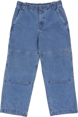 Loose fit with reinforced double knees for durability. Stylish diffused blue-white wash pairs skate functionality with casual streetwear flair. Comfortable and rugged.