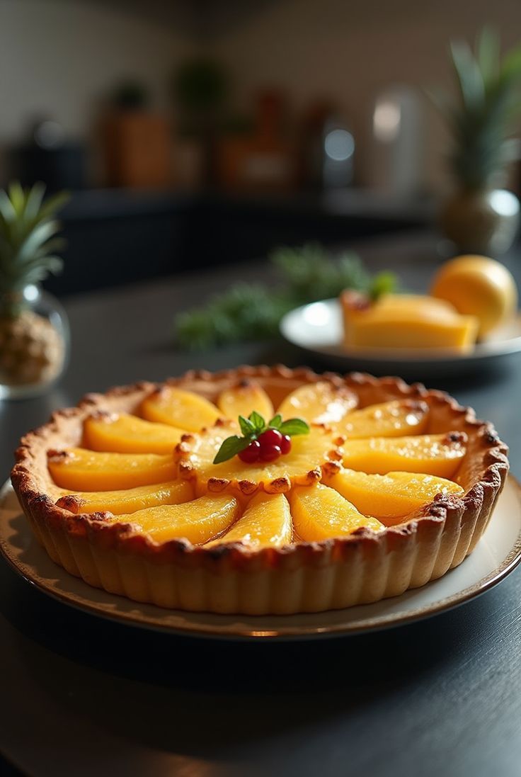 The Pineapple Pie is a tropical dessert featuring a sweet and tangy pineapple filling encased in a buttery, flaky crust. Its refreshing flavor and golden appearance make it a delightful treat, perfect for any occasion or as a light, fruity dessert.